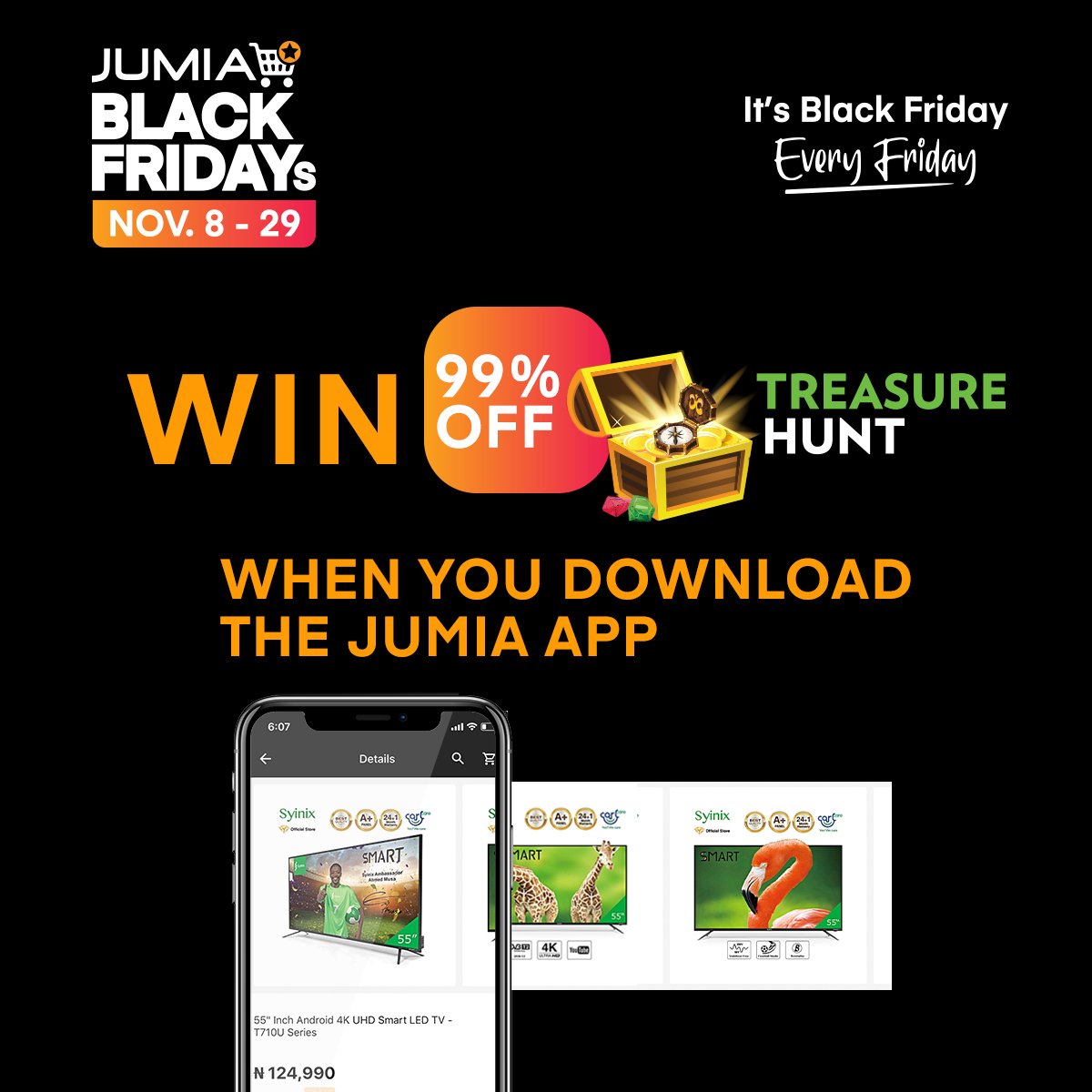In the jumia black friday treasure hunt there are fantastic opportunities for every shopper. Participate in our game of treasure hunt and enjoy jumia s biggest giveaways jumia ugandabrings you the biggest online treasure hunt fast delivery free returns. Download and install the jumia mobile shopping app today for the best shopping experience in nigeria available on google play and apple store for android and ios click here for the download links.